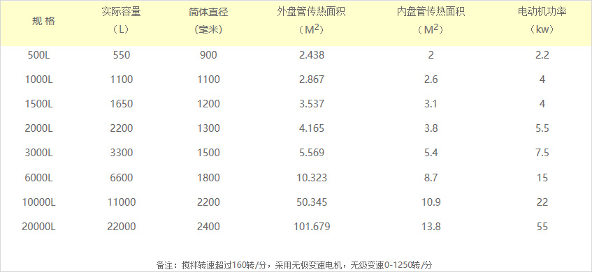 反应釜釜体下部有放料孔,釜内有搅拌器,釜盖上开有进料、搅拌、观察、测温、测压、蒸汽引出分馏、安全放空等工艺管孔。加热盘管上开有进、排油(汽)、测温、放空等接管孔,可通蒸汽、导热油、水实现加热或冷却。根据物料生产要求和用户所需而确定压力、温度、材质、搅拌装置类型、转速、密封结构、加热方式等进行设计制造。反应釜品种规格多样,压力10MPa出下,容积有0.1~10立方不等。